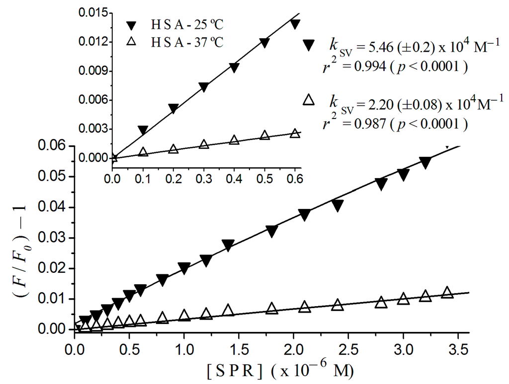In Figure 2, it is possible to observe the linear tendency of Stern-Volmer plots of HSA at 25 and 37 °C. The detail of this figure shows plots for (sulpiride) <0.6 × 10−6 M with respective constants, 2.20 (±0.08) × 104 M−1, at 37 °C, and 5.46 (±0.20) × 104 M−1, at 25 °C. It also presents regression coefficients, r2 = 0.984 at 37 °C and r2 = 0.994 at 25 °C for p < 0.0001.
