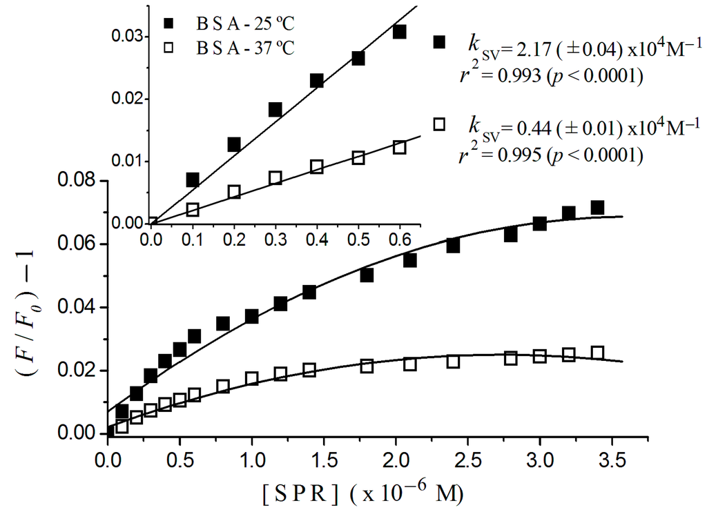 Figure 3 shows plots for BSA, where it was possible to fit a linear adjust to sulpiride concentrations lower than 0.6 × 10−6 M, with regression coefficients of 0.995 at 37 °C, and 0.993 at 25 °C for p < 0.0001. From an overall view, we can see a downward concave curvature toward the x-axis for sulpiride for concentrations higher than 0.6 × 10−6 M. In the figure inset, we can see Stern-Volmer constants of 0.44 (±0.01) × 104 M−1, at 37 °C and 2.17 (±0.04) × 104 M−1, at 25 °C.