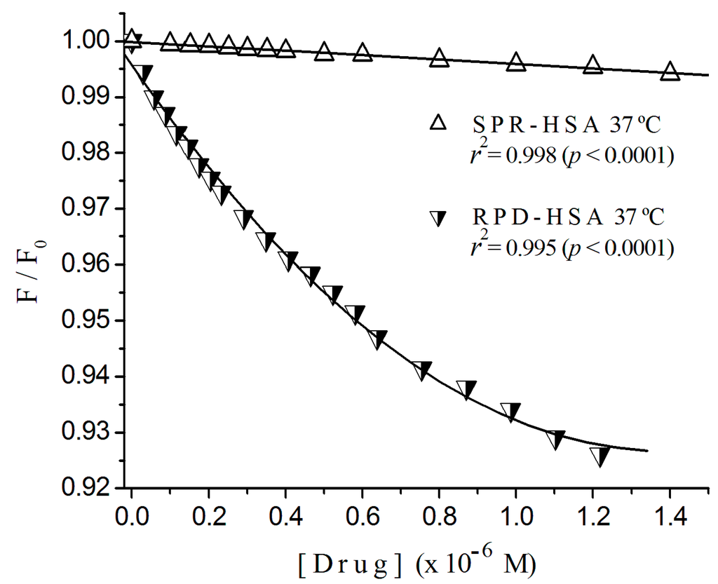 The presence of primary and secondary inner filter effects was verified by means of absorbance measurements (Shimadzu UV-160A spectrophotometer, Columbia, Portland, OR, USA) of albumin solutions at emission and excitation wavelengths. The secondary inner filter effect was negligible, and the primary inner filter effect was corrected by Parker’s equation [39]. Comparing Stern-Volmer plots at two temperatures, 25 and 37 °C, we verified the dynamic or static nature of the quenching process but only for HSA.