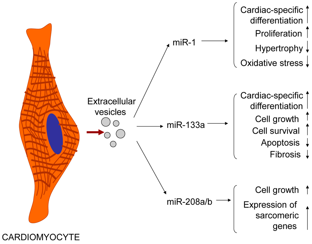 Cardioprotective properties of exosomal cardiac-specific microRNAs released by injured cardiomyocytes in acute myocardial infarction on cardiac muscle cells and resident cardiac stem/progenitor cells.