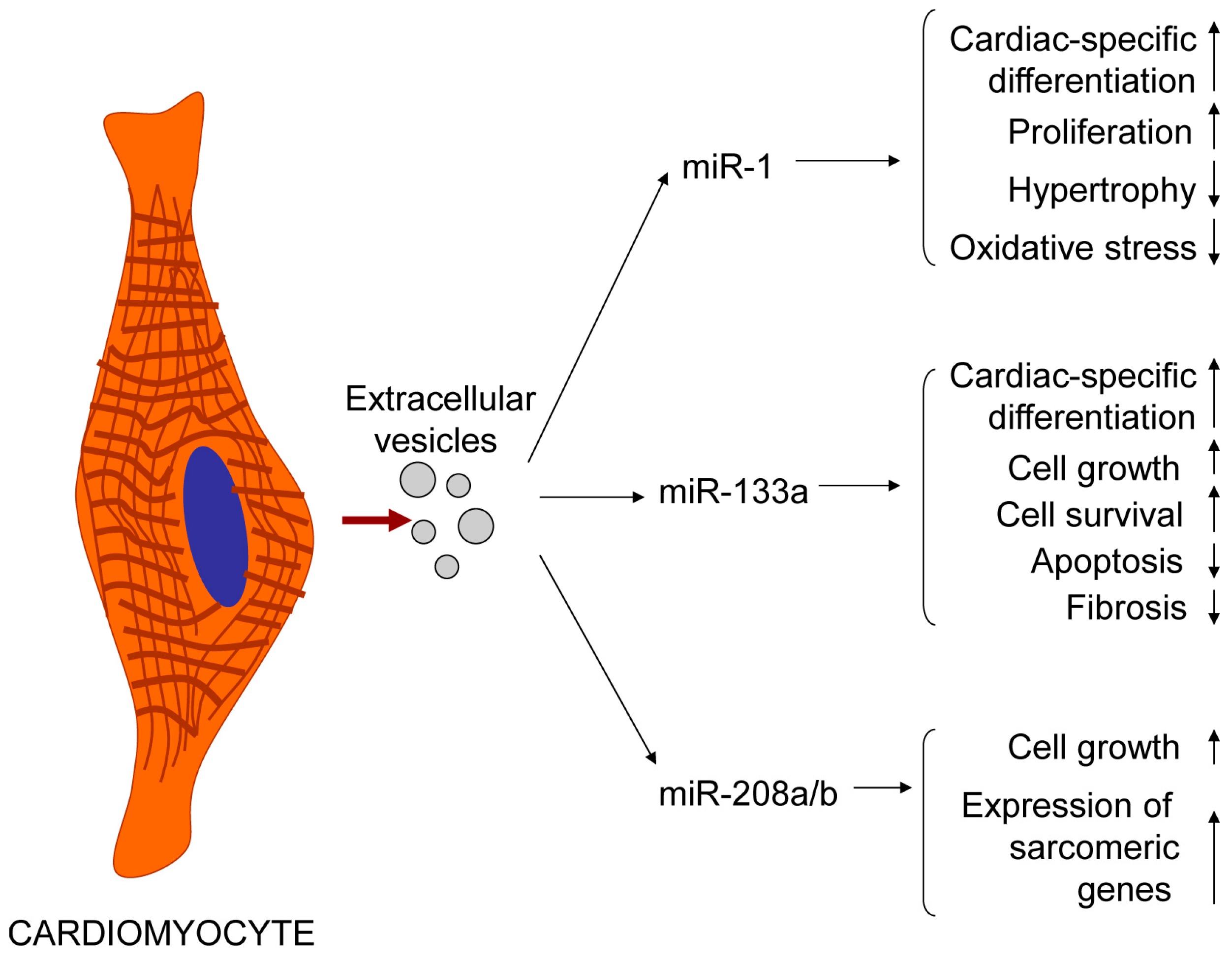 In infarcted heart, a proper control of cardiac remodelling is frequently missing. Due to increased cardiac workload, this maladaptation could lead to the induction of arrhythmias, tachycardia, left ventricular hypertrophy and increased risk of heart failure [93]. In order to stimulate heart healing, cardiac fibroblasts and myocytes are shown to shed exosomes containing miRNAs (such as miR-21*, miR-208a and miR-499) with hypertrophic function [49,94]. However, due to the lack of a proper control, overproduction of these exosomes will favour the development of cardiac hypertrophy.