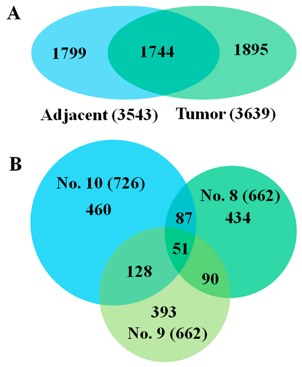 Venn diagrams of total identified proteins and dysregulated proteins. (A) Total proteins identified from three cases in tumor or adjacent tissues respectively. One thousand seven hundred forty-four proteins identified appear in both tumor and adjacent tissues; (B) The number of proteins with more than twofold differential expression in three cases, respectively, and the number of proteins shared in two or three cases.