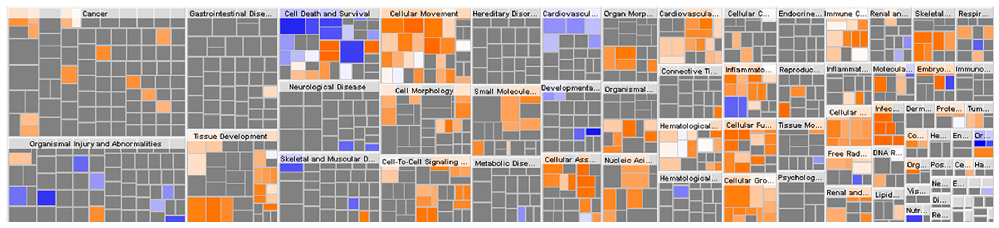 The hierarchical heatmap of 146 dysregulated proteins analyzed by Ingenuity Pathway Analysis (IPA). The major boxes represent specific family or category of related functions. The smaller squares within the major boxes represent the number of proteins. Each individual square represent a specific protein. Colored squares indicate protein predicted state: increasing (orange), or decreasing (blue). Darker colors indicate higher absolute Z-scores.