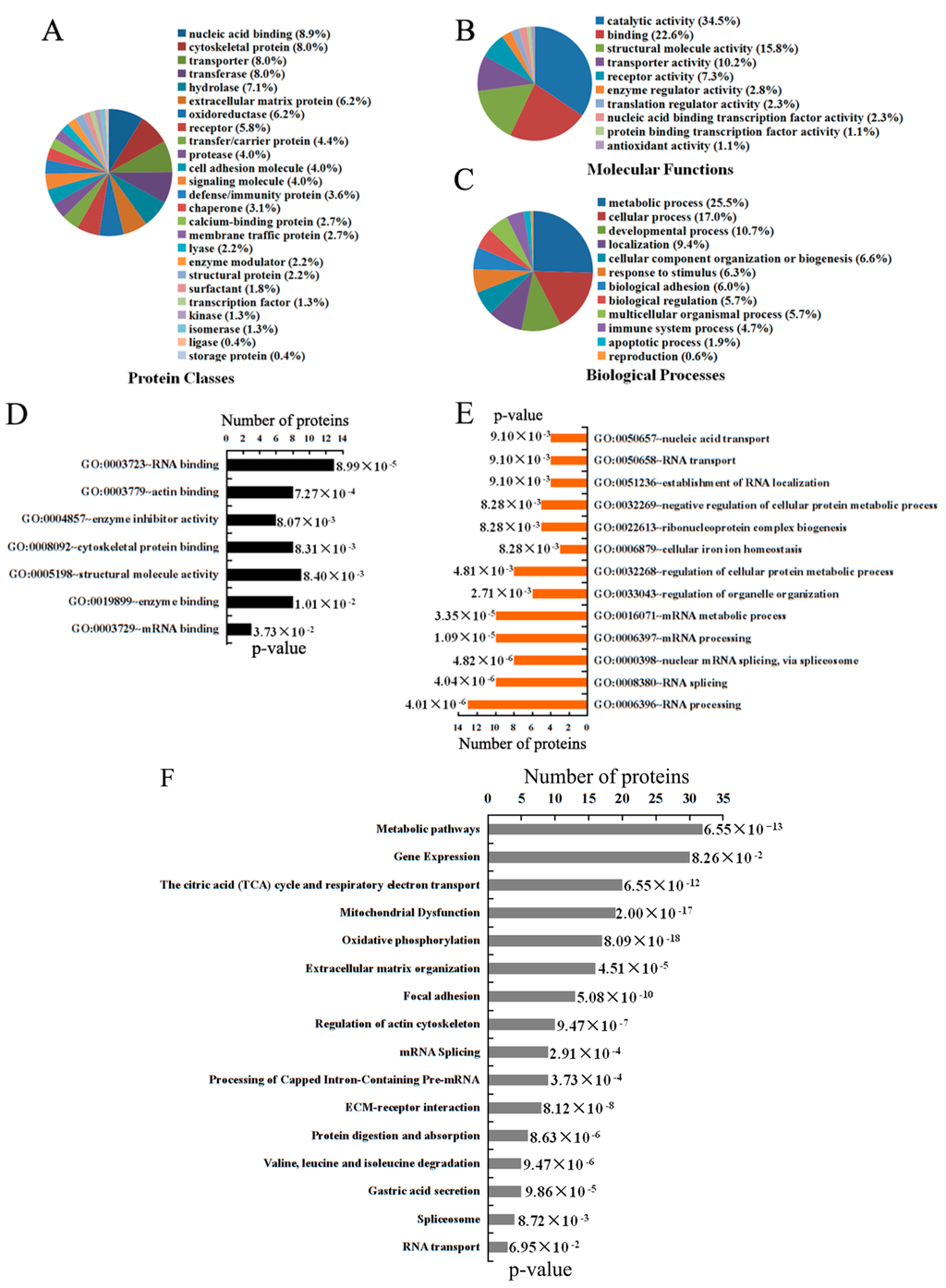 Protein Analysis Through Evolutionary Relationships (PANTHER) is a comprehensive database used to analyze protein family, gene ontology and pathways for proteins with different abundances between adjacent and tumor tissues [22]. PANTHER analysis showed that 146 dysregulated proteins could be categorized into 25 protein classes in which nucleic acid binding proteins comprised the largest group (8.9%) (Figure 3A). According to the Meta-analysis, these proteins were most associated with metabolic (25.5%), and cellular (17.0%) processes, among others (Figure 3B). This study also revealed that molecular functions of these proteins were mostly concerned with catalytic (34.5%) and binding (22.6%) activity (Figure 3C). We performed additional analysis using the Database for Annotation, Visualization and Integrated Discovery (DAVID) in order to further shed light on functional annotation of these dysregulated proteins. DAVID contains an integrated biological knowledgebase and extracts biological meaning from large gene/protein lists at systematically [23]. The results in Table S3 show that 146 differentially express proteins possessed various molecular functions and biological process. Further examination of the group of 65 upregulated proteins, DAVID revealed that their main functions is RNA and protein binding, pointed to biological processes of RNA splicing and processing, as well as metabolic processes (Figure 3D,E and Table S3, Supplementary Material).