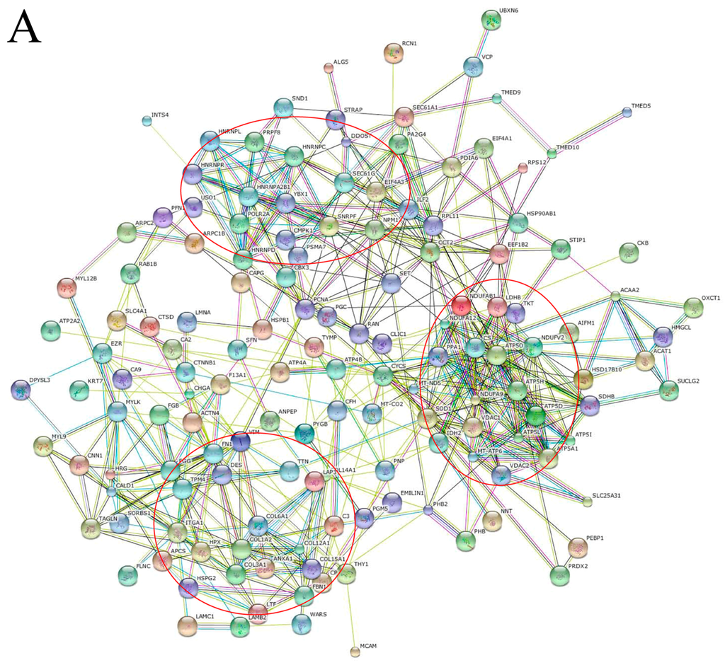 STRING predicted protein-protein interaction of 146 dysregulated proteins showed that most of them could interact with each other and formed strong networks with three dynamic clusters. The first cluster was mostly populated with nucleic acid binding proteins, such as heterogeneous nuclear ribonucleoproteins (hnRNPs) of hnRNPL, hnRNPR, hnRNPA2B1, hnRNPD and hnRNPC, Y-box binding protein 1 (YBX-1) and nucleophosmin (NPM1). The second cluster was made up of metabolic proteins, for example ATP synthase (ATP5H, ATP5L, ATP5A, ATP5D, ATP5I, MT-ATP6), citrate synthase (CS), NADH dehydrogenase [ubiquinone] 1, superoxide dismutase (SOD). The final cluster identified contained extracellular matrix proteins, such as collagens (COL6A1, COL1A2, COL3A1, COL12A1, COL15A1, COL14A1), fibrillin-1 (FBN1), desmin (DES) and vimentin (VIM) (Figure 4A).We selected 65 upregulated proteins in tumor tissues to further analyze protein-protein interaction as downregulated proteins may not be suitable for potential biomarkers [26]. The results showed that upregulated proteins could also form an interactive network (Figure 4B). In the central network, nucleic acid binding proteins were dispersed and located in the keynotes of network, for example NPM1, YBX-1, hnRNPA2B1, hnRNPD, GTP-binding nuclear protein Ran (RAN), small nuclear ribonucleoprotein F (SNRPF). Additionally, proteins in this cluster extend out to connect with some important functional proteins, such as proliferating cell nuclear antigen (PCNA), VIM, 14-3-3 protein sigma (SFN).