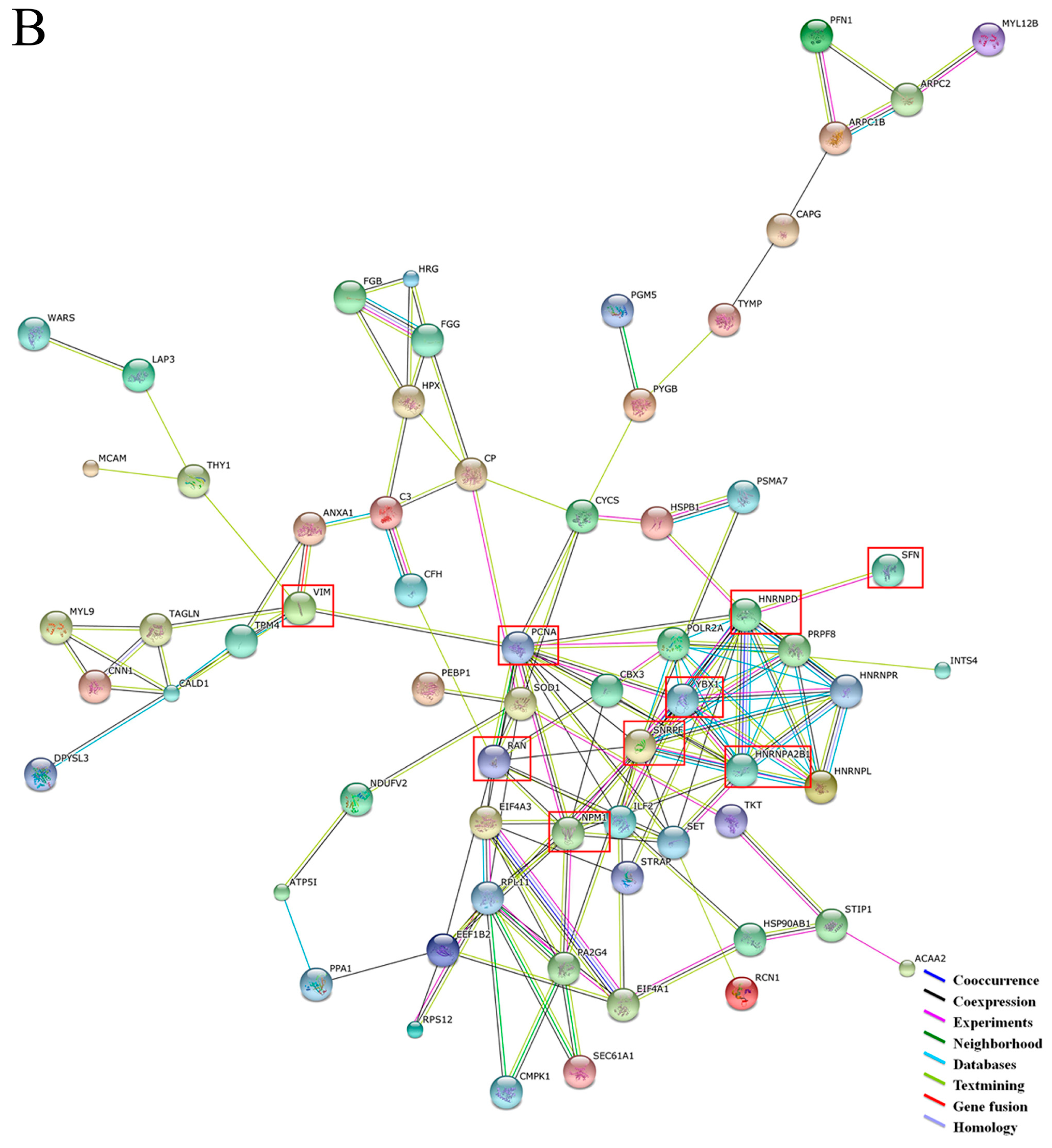 | Cell Death and Survival | 74 | 1.98 × 10−10–2.53 × 10−3 | ACAT1, CCT2, CFH, CP, CTNNB1, CYCS, DPYSL3, EZR, F13A1, FGG, FN1, HNRNPC, NPM1, VIM, YBX1, … |