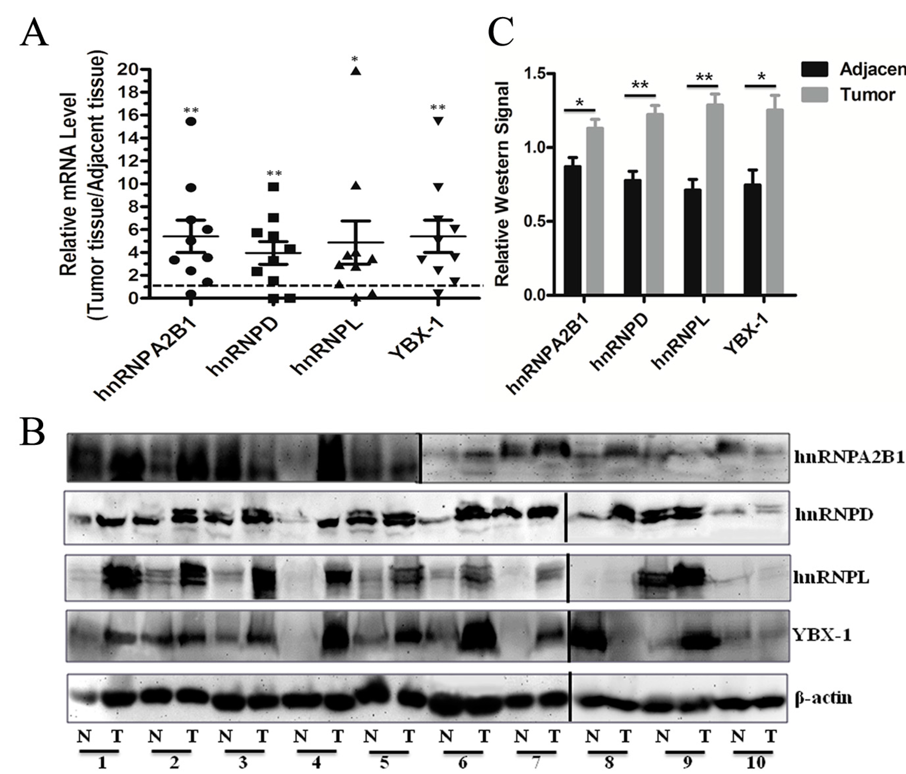 Expression levels of hnRNPs and YBX-1 in GC and adjacent tissues. (A) qRT-PCR (n = 10) results showing the mRNA expression of hnRNPs and YBX-1. The ratio below the dotted line represented down-expression in GC tissues; otherwise represented up-expression in GC tissues; (B) Western blots (n = 10) of hnRNPs and YBX-1. N represent adjacent tissue and T represent tumor tissue; (C) Grayscale scanning of western blots bands. The ratio was compared to β-actin and statistically analyzed. Significance of differences between GC and adjacent tissues are displayed by ** p-value < 0.01 or * p-value < 0.05.
