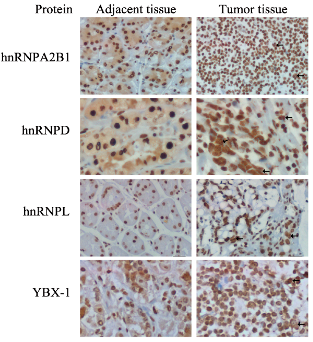 Proteins highly abundant in tumors might be detectable with better reproducibility by immunohistochemistry (IHC), which can also reveal the distribution status of particular proteins in cells and tissues. With specific antibodies hybridization, IHC results showed a stronger and higher density positive nuclei staining for all three hnRNPs and YBX-1 in GC tissues than in adjacent normal tissues (Figure 6). Cancer cells undergoing cell proliferation have larger and multiple nuclei (arrows shown) compared to normal cells. Furthermore, by observing protein expression and distribution, the slides stained with hnRNPA2B1, hnRNPD and YBX-1 antibodies displayed a weak (1+) to moderate (2+) glandular epithelium cell cytoplasm and nucleus staining in adjacent tissues, whereas there were only strong (3+) nucleus staining in tumor tissues were found. HnRNPL did not appear in cytoplasms. Immunohistochemistry not only confirmed the expression of four upregulated proteins in accordance with qRT-PCR and western blot results, but also revealed nucleo-cytoplasmic shuttling of hnRNPA2B1, hnRNPD and YBX-1.
