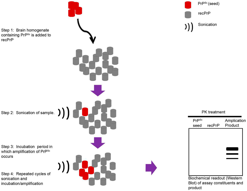 Diagrammatic representation of cell-free conversion assays. A small quantity of a brain homogenate containing PrPSc, usually at quantities lower than is normally detectable when immunoblotting, is added to a pool of “normally” folded host-encoded protein. This can be either purified recombinant proteins (recPrP) or an uninfected brain homogenate. Briefly, the assays undergo periods of incubation, whereby the PrPSc seeds can interact with recPrP and cause protein misfolding and aggregation. Intermittently, periods of sonication are used to break down larger aggregates to allow further conversion of recPrP to PrPSc. The assay products are then assessed using Western blot analysis. These systems result in a large accumulation of PrPSc, which have occurred in a cell-free system, and, as the result of protein-templated conversion directed from the initial extremely small quantity of PrPSc added to the reaction in the first instance.