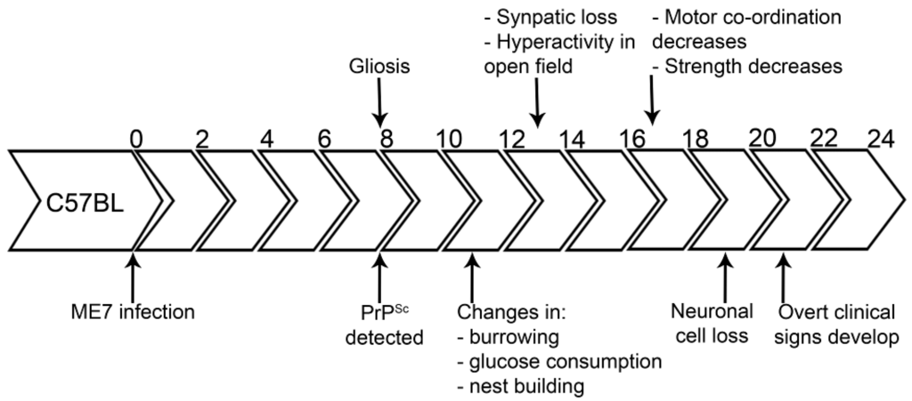 Following inoculation with a TSE agent, small accumulations of PrPSc can be initially detected in restricted regions of the brain, shortly followed or concurrently with glial cell responses (microglia and/or astrocytes), often within the same brain regions. This is followed by synaptic protein loss and electrophysiological deficits. It is around this time that early behavioural deficits may be observed i.e., changes in burrowing behaviour and glucose consumption [62,63,64,65,66]. Indeed, the behavioural deficits can be correlated to synaptic loss in specific brain regions such as the hippocampus and hypothalamus [67,68]. Throughout the time course of disease, behavioural changes become more marked and varied from their first manifestation. Finally, neuronal loss and the clinical onset of disease can be observed. An example of a time course of TSE disease is summarised in Figure 2.