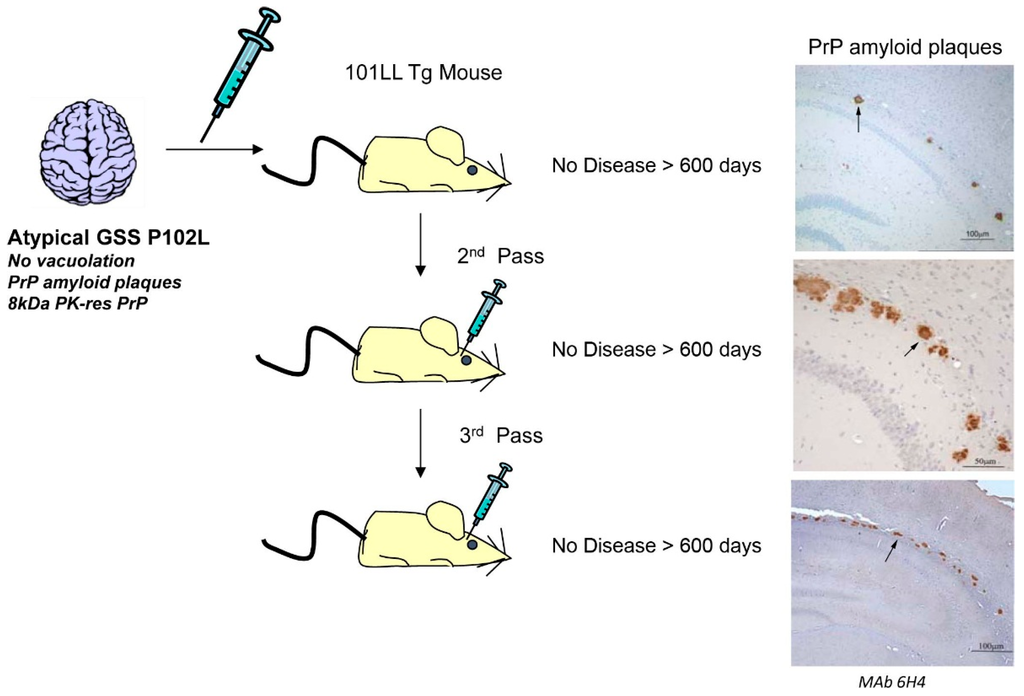 The relationship between misfolded PrP and infection has been further confounded by the inoculation of partially purified PrPSc from a patient with atypical GSS P102L into 101LL mice, which resulted in the accumulation of large multicentric amyloid plaques in restricted areas of the brain but no clinical disease or spongiform degeneration of the brain. Subsequent sub-passages of the brain material from these mice into 101LL mice showed the presence of PrP amyloid without any clinical signs of disease (Figure 3) [5]. These studies demonstrate that infectivity may not always be directly related to PrP pathogenicity, and, moreover, protein accumulation in the CNS does not always lead to a clinical disease [5,74,168]. This raises the question of which PrPSc isoform(s) are neurotoxic, which are associated with infectivity and what is the molecular distinction between these two PrPSc species.