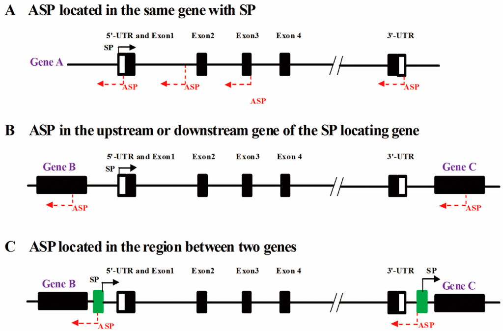 Identification of the positions of ASPs can help in clarifying their potential regulatory functions and analyzing the transcription start sites (TSSs) and transcriptional mechanisms of natural antisense transcripts [33]. ASPs are generally located on the strand opposite from coding genes [33,34]. The locations of ASPs can be divided into three types relative to the locations of the sense transcript promoters (SPs): in the same gene as the SP (Figure 1A), in genes upstream or downstream of the SP (Figure 1B), or in intergenic regions (Figure 1C). When an ASP is located in the same gene as the SP, it can be present in the 5′-UTR, exons, introns or 3′-UTR of the gene (Figure 1A).