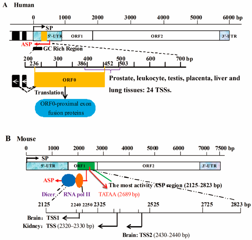 Schematic representation of the position of L1 ASPs in humans and mice. (A) The L1 5′-UTR (human) harbors an ASP (red reverse arrow) and a SP (black arrow) [36,37]; the mouse L1 ASP (red arrow showed in (B) is within ORF1 [37]. The G-C base rich (GC-rich) region (0–485 bp, black box) plays a role in the activity of the L1 ASP. There are 24 TSSs (transcription start sites) in purple arrow mapped to the opposite strand of the L1 5′-UTR. Interestingly, the L1 ASP functions as an alternative promoter, generating not only antisense transcripts, but also chimeric mRNAs [36]. ORF0 (yellow rectangle), a primate-specific open reading frame-0 located in 236–452 bp, not only contributes to the generation of ORF0-proximal exon fusion proteins but also enhances L1 mobility and there are 24 TSSs of various tissues located in 386–503 bp (purple bracket) [25]. The wright arrows means the transcriptional direction of ORF0, and the black dotted line and connected black boxes represent its transcript alternative splicing; (B) The mouse L1 ASP is located in ORF1, which includes a TATAA sequence at 2689 bp (orange arrow) and the ASP region with the highest activity from 2125 to 2823 bp (green frame) [37]. It has been demonstrated that RNA polymerase II (orange circle) and Dicer (blue circle) participate in the L1 ASP transcriptional initiation complex, with the latter playing a modest role in limiting native L1 retrotransposition. There are also different TSSs located in the L1 ASP, such as brain tissue-specific TSSs located at 2240–2250 bp and 2430–2440 bp (black reverse arrow); a kidney-specific TSS is located at 2320–2330 bp (black reverse arrow). The difference between the L1 ASPs of humans and mice is due to evolutionary events [3].