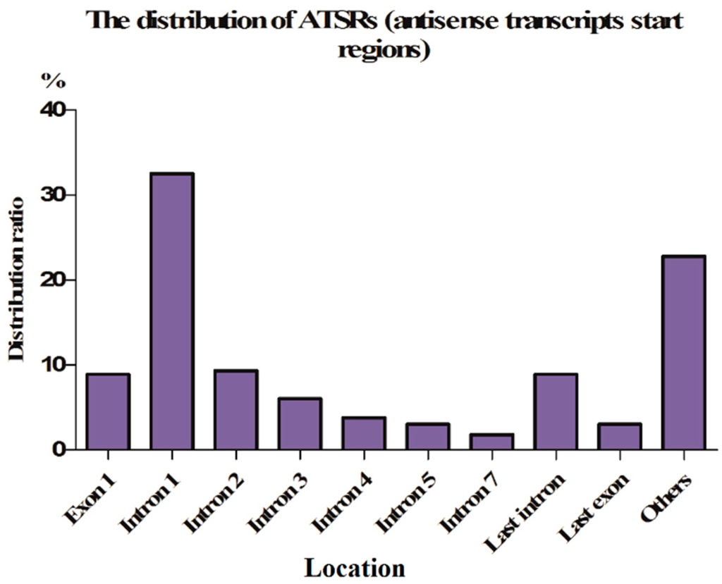 The methylation signals of the 5′-end of intron 1 and the promoter region in most human genes are very low. However, TSS signals of antisense transcripts are gradually reduced from the 5′-end to the 3′-end of intron 1 but are markedly higher than those of the other introns, by 1.5–5 times, and the antisense transcript TSSs are normally distributed on both sides of the junction between exon 1 and intron 1 [33]. In other words, antisense transcript TSSs are mainly distributed at the 3′-end of exon 1 and the 5′-end of intron 1. He et al. [53] reported the interesting finding that higher ASP activity is found with a greater distribution of antisense transcript TSSs.