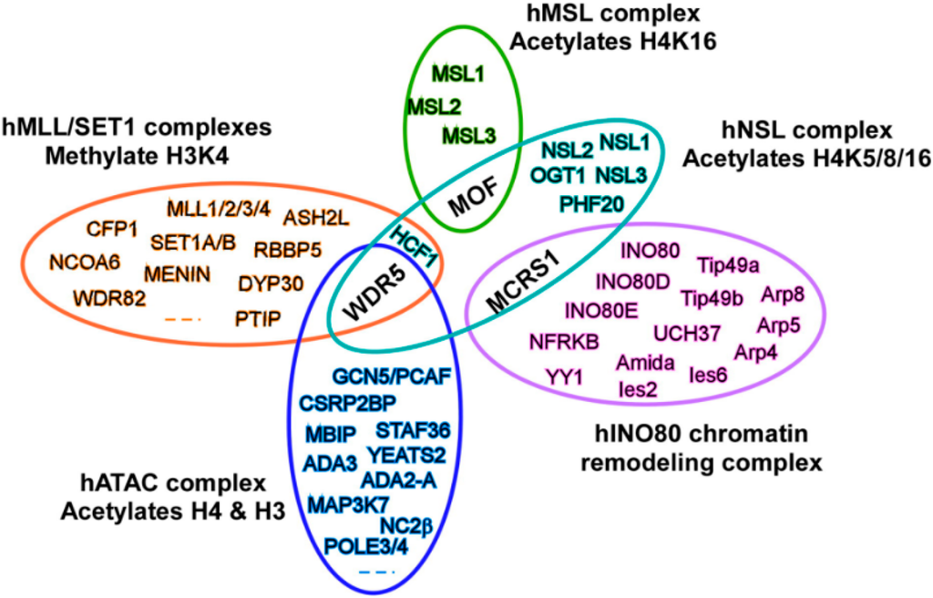 - Zhao, X.; Su, J.; Wang, F.; Liu, D.; Ding, J.; Yang, Y.; Conaway, J.W.; Conaway, R.C.; Cao, L.; Wu, D.; et al. Crosstalk between NSL histone acetyltransferase and MLL/SET complexes: NSL complex functions in promoting histone H3K4 di-methylation activity by MLL/SET complexes. PLoS Genet. 2013, 9, e1003940. [Google Scholar] [CrossRef] [PubMed]