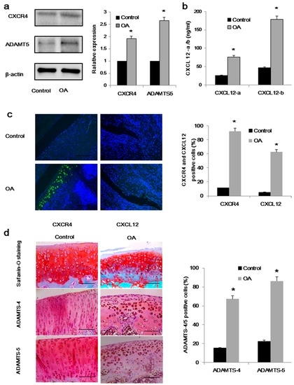 Expression of CXCL12/CXCR4 and ADAMTS-5 are upregulated in rat osteoarthritic samples: (a) Western blot analysis of ADAMTS-5, and CXCR4 expression in chondrocytes and synoviocytes isolated from osteoarthritis subjects and healthy control subjects, with quantification on the right. β-Actin served as a loading control (n = 4 for each group, * p < 0.05); (b) ELISA evaluated the CXCL12a/b levels from healthy control and osteoarthritic synovial fluid (n = 4 for each group, * p < 0.05); (c) immunofluorescence analysis of CXCL12-stained cells and CXCR4-stained cells in chondrocytes and synoviocytes representative of osteoarthritis and healthy control subjects, with quantification on the right (n = 5 for each group, * p < 0.05); and (d) staining for ADAMTS-4/5 in superficial chondrocytes of osteoarthritis and healthy control cartilage. The severity of osteoarthritis is moderate, as evaluated by the Mankin scores. Counterstaining is by safranin orange; scale bar, 100 μm. The number of ADAMTS-4/5-stained cells analyzed is provided on the right (n = 5 for each group, * p < 0.05).