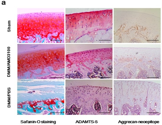 Based on these results, it was unclear whether CXCL12 and CXCR4 expression was simply correlated with aggrecanase activation in OA or was indeed a causative agent of disease pathology. To address this issue, we performed in vivo analyses, and found evidence that aggrecanase activation and cartilage loss are directly related to the CXCL12/CXCR4 axis. Blocking the CXCL12/CXCR4 axis attenuated these effects by inhibiting the degradation of aggrecan, further establishing the function of the CXCL12/CXCR4 pathway in PTOA progression (Figure 2). In a murine model of OA, less severe damage was observed in the DMM/AMD3100-treated group than in DMM/PBS-treated controls, indicating that AMD3100 effectively prevented PTOA-associated articular cartilage damage (Figure 2a). These results are consistent with earlier studies that showed that increased CXCL12/CXCR4 expression leads to reduced MMP expression and reduced matrix degradation [12,27], while inhibiting cartilage pathogenesis attenuated by the CXCL12/CXCR4 axis, increasing the overall severity of OA [18,28]. This is the first study that has focused on the role of the CXCL12/CXCR4 pathway on aggrecanase-mediated cartilage loss.