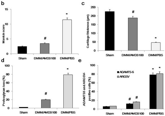 Safranin orange staining and immunohistochemistry revealed typical signs of proteoglycan loss and severe cartilage damage accompanied by enhanced ADAMTS-5 and aggrecan neoepitope (374ARGSV) expression in the affected knees of DMM/PBS-treated rats. These effects were significantly lower in the knee cartilage of both DMM/AMD3100-treated rats and sham controls (Figure 2a). Using the Mankin score, the degree of OA damage in each of these three groups was quantified by three blinded observers. Mankin scores were significantly lower (3.5 points; p < 0.05) in the DMM/AMD3100-treated group than in the DMM/PBS-treated rats (11.5 points); no significant differences were found between the DMM/AMD3100-treated group and sham controls (p > 0.05; Figure 2b). Samples collected from DMM/PBS-treated rats also exhibited a significant reduction in cartilage thickness (Figure 2c), along with a substantial loss of proteoglycans (Figure 2d). AMD3100 treatment was largely protective against OA-like changes, as reflected by the low Mankin scores in this group (Figure 2b), along with greater preservation of cartilage thickness (Figure 2c). Quantification of safranin orange-stained cartilage in affected rat knees revealed a 78.9% decrease in proteoglycan loss among DMM/AMD3100-treated rats compared to the DMM/PBS-treated group (Figure 2d). Furthermore, ADAMTS-5 expression in the affected knees was largely inhibited by AMD3100 (p < 0.05; Figure 2e).