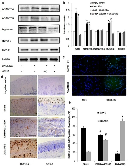 Treatment with 250 ng/mL CXCL12a significantly increased the expression of ACAN, RUNX-2, and ADAMTS-4 mRNA (p < 0.05); but it did not significantly affect SOX-9 and ADAMTS-5 expression. Chondrocytes treated with CXCR4 siRNA exhibited expression levels similar to that of the control group (Figure 3b). Regarding protein levels, primary chondrocytes cultured with 250 ng/mL CXCL12a for three days exhibited significant increases in the expression of ACAN, RUNX-2, and ADAMTS-4/5 (p < 0.05), combined with significant decreases in the expression on SOX-9 (Figure 3a, p < 0.05). Further analysis of primary chondrocytes pretreated with IL-1, followed by 250 ng/mL CXCL12a for three days, revealed strong induction of ADAMTS-4 and ADAMTS-5 by immunofluorescence. Taken together, these results indicate that the expressions of both ADAMTS-4 and ADAMTS-5 were enhanced by CXCL12a (Figure 3c). Immunohistochemical analyses of cartilage demonstrated that blocking the CXCL2/CXCR4 axis decreased the expression of Runx-2, while increased the expression of SOX-9 in rat PTOA model (Figure 3d,e).