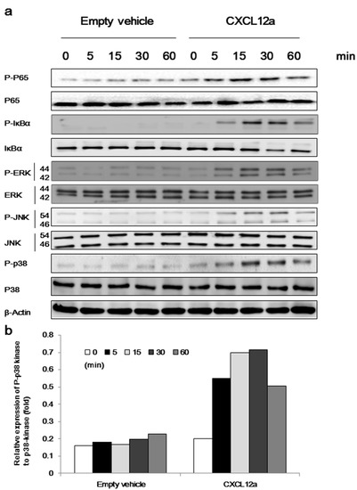 CXCL12a induces NF-κB activation and the phosphorylation of MAPKs. (a) CXCL12a induced phosphorylation of P65, IκBα, ERK, JNK, and p38. Pre-starved primary chondrocytes were treated with or without 250 ng/mL of CXCL12a for indicated times. The cell lysates were extracted for immunoblotting with the indicated antibodies and (b) Relative expression of P-p38 kinase to p38-kinase.