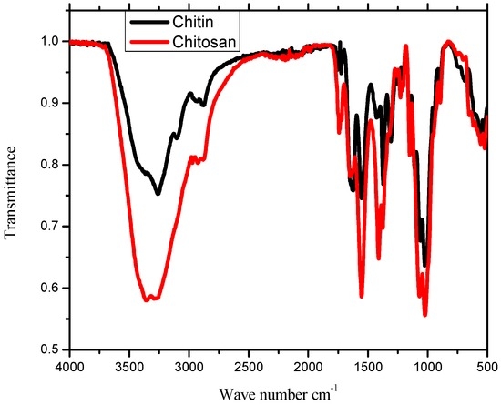 The IR spectra of chitin and chitosan are shown in Figure 2. The IR spectrum of chitin (Figure 2) was characterized by three important amide bands at 1624, 1555 and 1308 cm−1, which correspond to the stretching vibration of C=O, the bending vibration of the amide II band and C–N stretching vibration, respectively [13]. Other absorption bands observed at 3261, 2878 and 1153 cm−1 were attributed to O–H, C–H and C–O stretching vibrations, respectively, thereby confirming that the purified material was indeed chitin [14]. The infra-red spectrum of chitosan (Figure 2) exhibited a characteristic band at 3361 cm−1 attributed to the stretching vibration of the inter- and intra-molecular hydrogen bonds from the –NH2 and –OH groups, being similar to the previously-reported results [15]. The weak absorption band at 2925 cm−1 was assigned to sp3 C–H stretching vibrations. The intense peak around 1555 cm−1 corresponds to the bending vibration of NH2, a significant feature for chitosan. The higher intensity of this peak in chitosan compared to that observed in chitin and subsequent shortening of the peak intensity due to C=O stretch at 1651 cm−1 (Figure 2) indicates that deacetylation was successful [16,17]. The peak for the asymmetric stretch of C–O–C was observed at 1151 cm−1 [15,18,19]. The peaks at 1651 and 1372 cm−1 were attributed to C=O and C–N stretching vibration as amide I and amide III of chitosan, respectively [15].