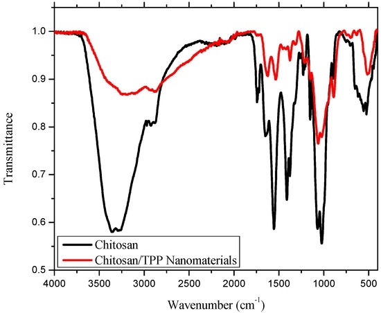 Formation of CS/TPP nanomaterial was confirmed by comparing the IR spectra of pure CS and CS/TPP nanomaterial (Figure 3). The IR spectra revealed the peak at 3361 cm−1 in pure CS that had shifted to 3204 cm−1 in CS/TPP nanomaterial (Figure 3) and broadened with decreased relative intensity at a ratio of 3:1 (A3361/A3204), manifesting an enhancement of hydrogen bonding [19]. The peak for the N-H bending vibration of amide IІ at 1555 cm−1 in CS had shifted to 1535 cm−1 in CS/TPP nanomaterial with relative reduced intensity at approximately a 5:1 ratio (A1555/A1535), while the amide І C=O stretch observed at 1651 cm−1 in CS shifted to 1625 cm−1 in CS/TPP (Figure 3). A new peak observed at 1214 cm−1 was attributed to a P=O stretching vibration, confirming a cross-linkage between CS and TPP during fabrication of the nanomaterials [19,20].