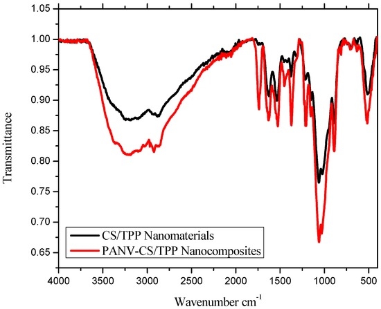 FTIR spectra of free CS/TPP nanomaterials and PANV-CS/TPP nanocomposites.