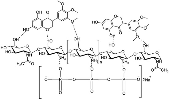 The IR spectrum of the PANV-CS/TPP nanocomposites showed a shift of absorption peaks when compared to the free chitosan nanomaterials (Figure 4). The absorption peak observed at 3208 cm−1 corresponds to OH and N–H, while other peaks at 1621, 1523, 1215 and 1155 cm−1 were assigned to the amide I (C=O) band, the amide II band, the P=O stretch and the asymmetric stretch of C–O, respectively (Figure 4). The new peak observed at 1733 cm−1 is due to the ketonic C=O stretch of PANV, confirming the successful encapsulation of the compound on the CS/TPP nano-framework. The encapsulation of PANV within the CS/TPP framework is probably enhanced by the hydrogen bonding between the methoxy and hydroxyl groups present in PANV and the hydroxyl groups on the polymer (Figure 5).