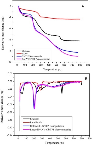 (A) Simultaneous thermal analysis (STA) curves of chitosan, PANV, free CS/TPP nanomaterials and PANV-CS/TPP nanocomposites; (B) Differential thermal gravimetric (DTG) curves of chitosan, PANV, free CS/TPP nanomaterials and PANV-CS/TPP nanocomposites.