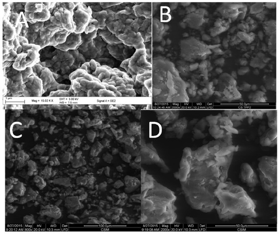 The scanning electron micrographs of pure chitosan showed an uneven and rough surface with a spongy appearance (Figure 7A). The rough surface of the chitosan is attributable to the low degree of deacetylation [29]. The SEM image (Figure 7B) of CS/TPP indicated non-uniform agglomerated particles with no clearly defined morphology. Agglomeration was also vivid when the bioactive compound was encapsulated, leading to the formation of a more compact non-uniform nanoformulation, as shown in the SEM images (Figure 7C,D). The particle sizes of CS/TPP materials ranged from 1.128 to 200 μm while those of PANV-CS/TPP nanocomposites had diameters ranging from 0.359 to 12 μm. The strong interaction caused by inter- and intra-molecular hydrogen bonding between the polyphenol and chitosan during the fabrication of CS/TPP-loaded nanocomposites might have contributed to the observed reduced size of the agglomerated particles (Figure 7C).