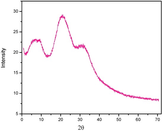 The powder X-ray diffraction patterns of CS/TPP (Figure 8) depicted the crystalline nature of the particles with intense reflections at 2θ = 8.15° and 20.93°, together with minor reflection 2θ at 30.33°. The XRD of the PANV-CS/TPP nanocomposite was not recorded due to sample limitations.
