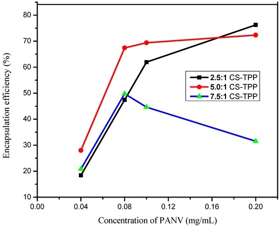 The effect of the test compound concentrations (0.04, 0.08, 0.1 and 0.2 mg/mL) and chitosan concentrations (1, 2 and 3 mg/mL) was evaluated to determine the encapsulation efficiency (EE). The results summarized in Figure 9 show that the increase of panchovillin concentrations from 0.04 to 0.2 mg/mL brought an increased EE under different chitosan concentrations. This effect is interpreted as the outcome of the improved intercalation of the polyphenol into the chitosan network ensuing an activation of hydroxyl sites and establishing stronger hydrogen bonding in the system [30]. A smooth increase in EE was observed when the 1 and 2 mg/mL chitosan solutions were used as compared to the chitosan solution of a 3 mg/mL concentration, which indicated a tremendous decrease in EE (Figure 9). This enormous decrease in EE with the increase in chitosan solution concentration might be due to the high viscosity of the gelation medium with a high concentration of chitosan, resulting in a decrease in the liquid phase resistance against dispersion and, hence, forming large nanoparticles and a further decrease in encapsulation [20]. The encapsulation efficiency decreased from 76.24% to 31.52% as the CS/TPP mass ratio increased from 2.5:1 to 7.5:1. Therefore, small CS/TPP ratios of 2.5:1 and 5.0:1 associated with low gelation medium and a low concentration of chitosan solution are suitable for higher encapsulation efficiency than a higher CS/TPP mass ratio of 7.5:1. A similar trend has previously been reported elsewhere [30]. Overall, the CS/TPP ratio of 2.5:1 is the best because it achieves higher EE and, hence, higher concentrations of the polyphenol, panchovillin. However, for further studies that included the in vitro release kinetics, the in vivo antimycobacterial assay and physical characterizations, the 5.0:1 CS/TPP ratio was preferred, for which the EE and loading capacity (LC) were found to be 70.12% and 0.36%, respectively.