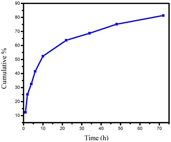 The in vitro release profile of the PANV-CS/TPP as prepared using the 5.0:1 CS/TPP solution is indicated in Figure 10. The in vitro release profile shows the initial burst of 42% of the PANV after six hours. The initial burst release is conceived to be due to the poorly-entrapped and adsorbed bioactive compound when it interacts with chitosan during the fabrication of the nanoformulation. The study further concluded that 81% of PANV was released within 72 h. The burst release observed in the present study at 6 h (Figure 10) could be desirable for the initial release of a high amount of the bioactive compounds with the ensuing quick and effective availability within 6 h.