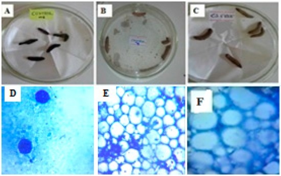 (A,D) Infected larvae (Positive control) and their appearance under the microscope at the magnification of 100×; (B,E) Non-infected Larvae (Negative control) and their appearance under the microscope at the magnification of 100×; (C,F) Larvae injected with Free CS/TPP and their appearance under the microscope at the magnification of 100×.
