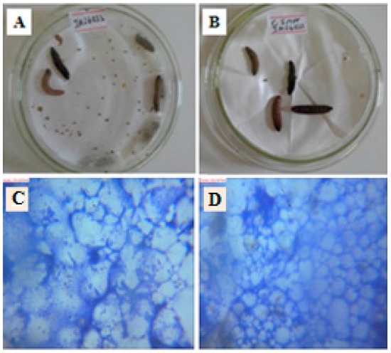 (A) Larva treated with the PANV and their appearance under the microscope at the magnification of 100× (C); (B) Larva treated with the PANV-CS/TPP nanocomposites and their appearance under the microscope at the magnification of 100× (D).