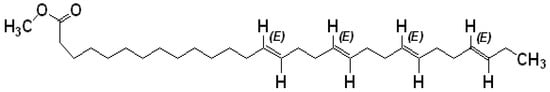 Amaranthus spinosus Linn. (Family: Amaranthaceae), commonly known as “spiny pigweed” or “spiny amaranth”, is used as vegetable and cultivated throughout India, Sri Lanka, and many tropical countries [11]. Traditionally, this plant has been used in diabetic complications, as a diuretic, analgesic, antipyretic, antileprotic agent, and in the treatment of bronchitis and piles [12]. A. spinosus is reported to possess antidepressant [13], anti-inflammatory [14], antimalarial [15], antiandrogenic [16], antihyperlipidemic, and spermatogenic activities [17]. Administration of A. spinosus extract restored the altered hematological parameters in pigs [18] and normalized biochemical changes in the epididymis of rats [19]. Amaranthine, isoamaranthine, hydroxycinnamates, rutin, quercetin, and kaempferol glycosides are some of the phytochemical constituents identified in A. spinosus. According to previous studies, leaves of A. spinosus possess significant antitumor and cytotoxic activities [20,21]. However, the active constituents responsible for such activities were not specified. In this respect, we have recently isolated and purified one novel fatty acid—namely,(14E,18E,22E,26E)-methyl nonacosa-14,18,22,26 tetraenoate (Figure 1)—from the whole plant of A. spinosus, and reported antidiabetic activity of this fatty acid [22]. Nevertheless, the potential anticancer effect of the aforementioned fatty acid has yet to be examined, to our knowledge. Thus, in the present study, we have investigated the effect of the previously isolated fatty acid against the growth of HepG2 human liver cancer cells and defined the underlying mechanisms of action.