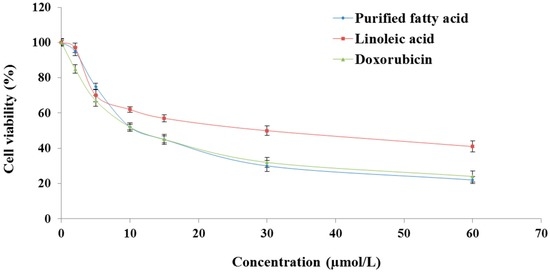 In vitro cytotoxic effects of purified fatty acid from A. spinosus, linoleic acid, and doxorubicin in HepG2 cells. HepG2 cells were seeded in a 96-well plate (10,000 cells/well) 24 h prior to the addition of each test material. Following 48h incubation with the extract, cell proliferation was determined by the 3-[4,5-dimethylthiazol-2-yl]-2,5-diphenyltetrazolium (MTT) assay. Each data point represents mean ± standard deviation based on quadruplicate determinations in three to five independent experiments.