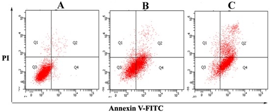 Flow cytometric analyses of A. spinosus fatty acid-induced apoptosis in HepG2 cells using annexin V-fluorescein isothiocyanate (FITC)/propidium iodide (PI). Quadrants: Q3 (normal cells), Q4 (apoptotic cells), Q2 (late apoptotic/necrotic cells). The mean apoptotic population for (A) control (normal cells); (B) 25 µmol/L; and (C) 60 µmol/L of fatty acid-treated HepG2 cells in 24 h, respectively.