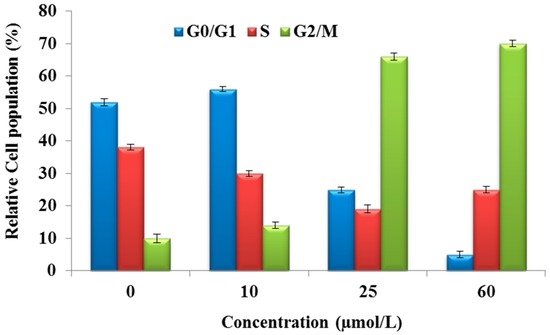 The cell cycle consists of four distinct phases, which are cell growth (G1 phase), DNA synthesis (S phase), cell division (G2 phase), and mitosis and DNA replication (M phase). The alteration in cell cycle induced by the fatty acid was assessed by flow cytometry using PI staining of HepG2 cells after 24 h. It was found that the mean percentage of cells in the G2 phase increased from 10% ± 1.31% to 14% ± 1.06%, 66% ± 1.03%, and 70% ± 0.99% after treatment with 0, 10, 25, and 60 µmol/L fatty acid, respectively (Figure 4). Our results indicated that the fatty acid treatment could arrest cells in the G2/M phases, which might be ascribable to the destruction of DNA replication and mitosis processes of HepG2 cells. This growth was accompanied by a reduction in the number of G0/G1 phase cells.