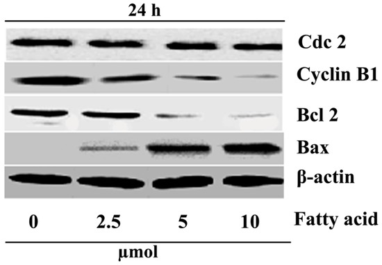 Overall results suggested that the fatty acid was capable of arresting the cells at the G2 phase and preventing them from entering the mitosis process. Generally, apoptosis is regulated biologically via two major pathways: the extrinsic pathway and the intrinsic pathway [19]. The intrinsic mitochondrial pathway is controlled by Bcl-2 family proteins. In humans, more than 20 members of this family have been identified so far, including proteins that suppress apoptosis (Bcl-2, Bcl-xL, Mcl-1 and A1), and proteins that promote apoptosis (e.g., Bax, Bak, Bad and Bid) [23]. The pro-apoptotic and anti-apoptotic proteins of the Bcl-2 family may turn on and off apoptosis because of the formation of heterodimers among these proteins [24,25,26]. The heterodimerization results in mutual neutralization of the bound pro- and anti-apoptotic proteins. For this reason, anti-apoptotic Bcl-2 family proteins are important players in cancer cell survival and are recognized as relevant targets in cancer treatment. In HepG2 cells treated with the tested fatty acid, the level of Bax was increased, and concomitantly that of Bcl-2 was decreased, suggesting that the fatty acid induced apoptosis through upregulation of Bax and downregulation of Bcl-2.