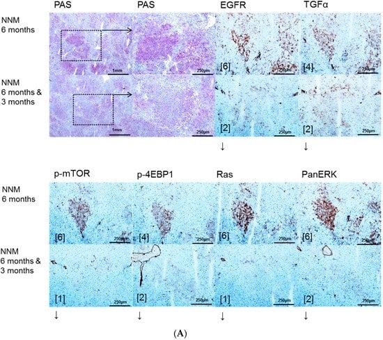 Effects of Gefitinib at six months after administration of N-Nitrosomorpholine (NNM) and expression patterns of epidermal growth factor receptor (EGFR), transforming growth factor α (TGFα) and downstream signaling in pre-neoplastic foci of altered hepatocytes (FAH) and neoplastic liver lesions. Gefitinib was administered daily for three months (10 mg/kg) (A); Glycogen storing foci of altered hepatocytes (FAH) after NNM administration (NNM 6 months) with an overexpression of EGFR and TGFα, which is reduced after Gefitinib treatment for three months (NNM 6 months & 3 months), implying downregulation of proteins of dependent signaling pathways of phosphatidyl-inositide 3 kinase/protein kinase B/mammalian target of rapamycin (PI3K/AKT/mTOR) (p-mTOR and phosphorylated 4E-binding protein 1 (p-4EBP1)) and rat sarcoma/rat sarcoma-activated factor/mitogen activated protein kinase/extracellular regulated kinase kinase (Ras/Raf/MEK/ERK) (Ras and PanERK) pathways, corresponding to less proliferative activity and volume fraction of FAH in Gefitinib treated rats (B). After six months of NNM administration (NNM 6 months), hepatocellular adenomas (HCA) and carcinomas (HCC) reveal a strong of TGFα, to a lesser extent of EGFR. Gefitinib treatment for two weeks or three months (NNM (6 months & 2 weeks)/(6 months & 3 months)) does not alter protein expression levels. Immunostaining scores are shown in brackets. Arrows correspond to ↑ upregulation, ↓ downregulation or ↔ unchanged expression level. Expression levels of immunostaining are given in brackets. Magnification: (A) overview 40×; marked lesion in dashed lines (PAS and immunostainings) 100×; and (B) (H & E and immunostainings) 100×; marked area in dashed lines (EGFR) 400×.