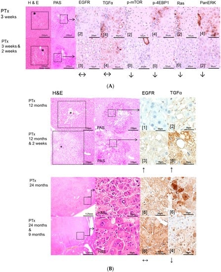 Effects of Gefitinib after intraportal transplantation of ovarian fragments in ovariectomized rats (OTX) and expression patterns of EGFR, TGFα and downstream signaling pathways in pre-neoplastic foci of altered hepatocytes (FAH) and neoplastic liver lesions. Gefitinib was administered daily for two weeks (20 mg/kg body weight) or 9 months (10 mg/kg), respectively. (A) Short-term experiments (three months). FAH of untreated rats (OTx 3 months) at the downstream level of transplanted ovarian fragments reveal loss glycogen storage (PAS) and a slight overexpression of EGFR and TGFα and also of downstream signaling with representative p-mTOR and PanERK, p-4EBP1 and Ras. After Gefitinib treatment for two weeks (OTx 3 months & 2 weeks), the EGFR and TGFα but not downstream signaling are slightly reduced; (B) Long-term experiments (12 and 24 months). Transplant tumors and associated FAH with unaltered EGFR but downregulated TGFα expression level after Gefitinib treatment for two weeks (OTx 12 months & 2 weeks) in comparison to untreated rats (OTx 12 months). Small HCAs (*) with upregulation of the EGFR and TGFα after Gefitinib treatment for 9 months (OTx 24 months & 9 months). Immunostaining scores are shown in brackets. Arrows correspond to ↑ upregulation, ↓ downregulation or ↔ unchanged expression level. Expression levels of immunostaining are given in brackets. Magnification: (A) 3 months/(3 months & 2 weeks) (H & E) 40×; marked area in dashed lines (PAS and immunostainings) 600×; (B) 12 months/(12 months & 2 weeks) (H & E) 40×; marked area in dashed line (H & E and immunostainings) 400×; 24 months/(24 months & 9 months) (H & E) 100×; marked area in dashed lines (immunostainings) 400×.