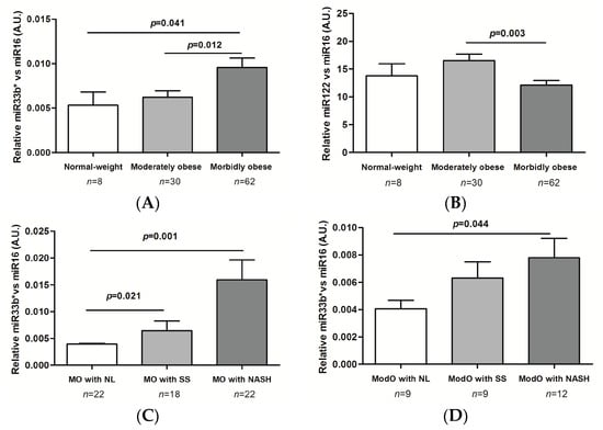 miRNA liver expression according to obesity degree and liver histology. (A) Differential expression of miR33b*; and (B) miR122 depending on the degree of obesity; (C) miR33b* liver expression in morbidly; and (D) moderately obese patients according to liver histology. Morbidly obese (MO) patients with normal liver (NL); MO patients with simple steatosis (SS); MO patients with nonalcoholic steatohepatitis (NASH); Moderately obese (ModO) patients with NL; ModO patients with SS; ModO patients with NASH; AU, arbitrary units. One-way ANOVA was used to compare the gene expression between groups. Results are shown as the mean ± SEM. p < 0.05 is considered statistically significant.