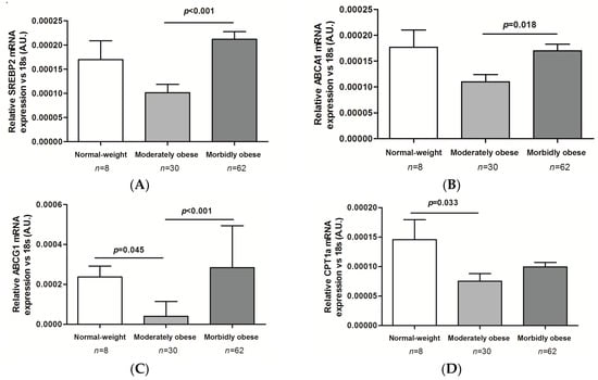 Liver expression of genes involved in lipoprotein secretion (A–C) and lipid oxidation (D) depending on the degree of obesity. ABCA1, ATP binding cassette transporters A1; ABCG1, ATP binding cassette transporters G1; CPT1α, carnitine palmitoyltransferase 1 alpha; SREBP2, sterol-regulatory-element-binding protein. Differences between groups were calculated using one-way ANOVA. Results are shown as the mean ± SEM. p < 0.05 is considered statistically significant.