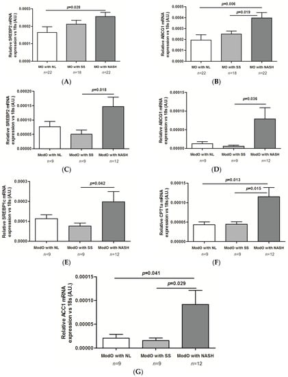Liver expression of SREBP2 (A) and ABCG1 (B) in morbidly obese patients according to liver histology and liver expression of genes involved in lipoprotein secretion (C–E); lipogenesis (F) and lipid oxidation (G) of moderately obese patients according to liver histology. Morbidly obese (MO) patients with normal liver (NL); MO patients with simple steatosis (SS); MO patients with nonalcoholic steatohepatitis (NASH); Moderately obese (ModO) patients with NL; ModO patients with SS; ModO patients with NASH; AU, arbitrary units. Differences between groups were calculated using one-way ANOVA. Results are shown as the mean ± SEM. p < 0.05 is considered statistically significant.
