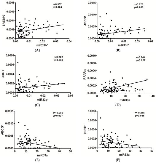 2.6. Significant Correlations of the miR33 a/b* and miR122 Expression with the Expression of Genes Involved in Lipid Metabolism