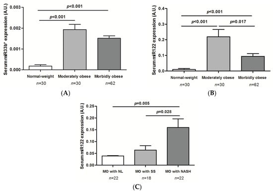 Circulating miR33b* (A) and miR122 (B) expression depending on the degree of obesity. (C) Differential circulating miR122 expression in morbidly obese patients according to liver pathology. MO with NL, morbidly obese patients with normal liver; MO with SS, morbidly obese patients with simple steatosis; MO with NASH, morbidly obese patients with steatohepatitis; AU, arbitrary units. Differences between groups were calculated using one-way ANOVA. Results are shown as the mean ± SEM. p < 0.05 is considered statistically significant.