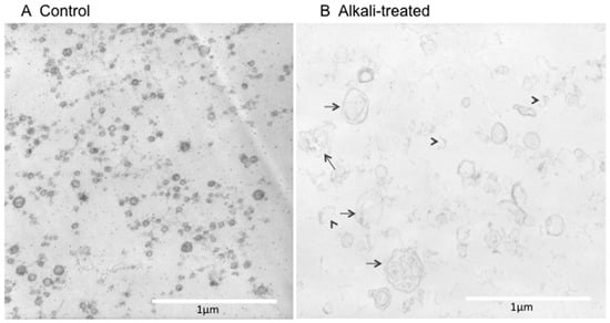 Urine EV samples were prepared from untreated human urine or urine treated with alkali/detergent for 20 min by an ultracentrifugation (see Materials and Methods). As shown in Figure 1A, vesicles with diameters of 20–100 nm were abundantly observed in normal urine. The size and shape of these vesicular structures were consistent with those of exosomes [,]. In contrast, EVs obtained from alkali/detergent-treated urine showed larger swollen vesicles (Figure 1B). The density of these vesicles membranes appeared to be thin, and many were disrupted (arrow heads, Figure 1B). Some of the vesicles became larger, possibly by fusing each other (arrows, Figure 1B). Similar observations were made in three independent experiments.