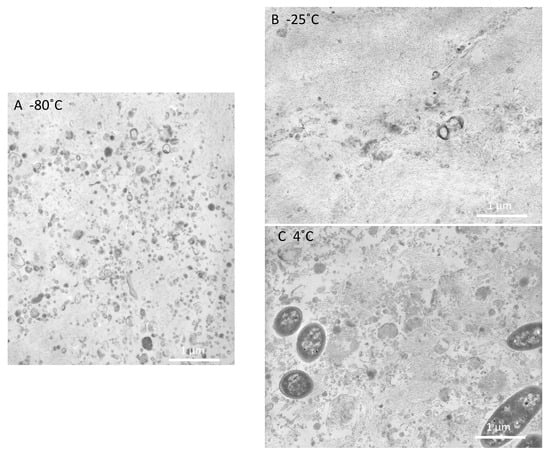 To examine the effects of storage temperatures on the structure of EVs, EV samples were stored at 4, −25, and −80 °C for one week. Abundant small vesicles were observed in the specimen stored at −80 °C (Figure 2A), and the sizes were the same as those observed in fresh urine (Figure 1A). In contrast, vesicle structures were rarely observed in specimens stored at −25 °C (Figure 2B). The specimens stored at 4 °C showed fewer vesicles with a slightly swollen appearance (Figure 2C). This sample contained fragments of bacteria that may have grown during storage at 4 °C. Similar findings were observed in three separate studies. These observations are consistent with our previous ELISA measurements in that AQP2 values were only detectable when samples were stored −25 °C or pre-treated with alkali/detergent and were not detectable when stored at 4 °C or −80 °C.
