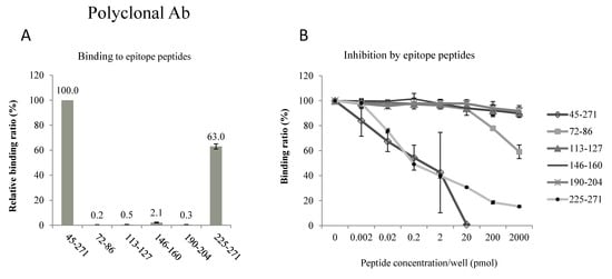 Regarding the monoclonal antibody, the binding assay showed that this antibody had affinity to the peptide 146–160 as well as to the immunogen peptide 45–271 (Figure 3B). The binding to the peptide 146–160 was 39.6% ± 3.0% of the binding to the immunogen 45–271 (mean ± standard deviation (SD), n = 3). No significant binding to other peptides was detected. The inhibition assay also showed that binding of this antibody to the peptide 45–271 was inhibited by peptide 146–160 as well as peptide 45–271 (Figure 3C). At the peptide concentration of 20 pmol/well, the inhibition was 80.1% ± 3.6% (mean ± SD, n = 3), indicating a strong inhibition.